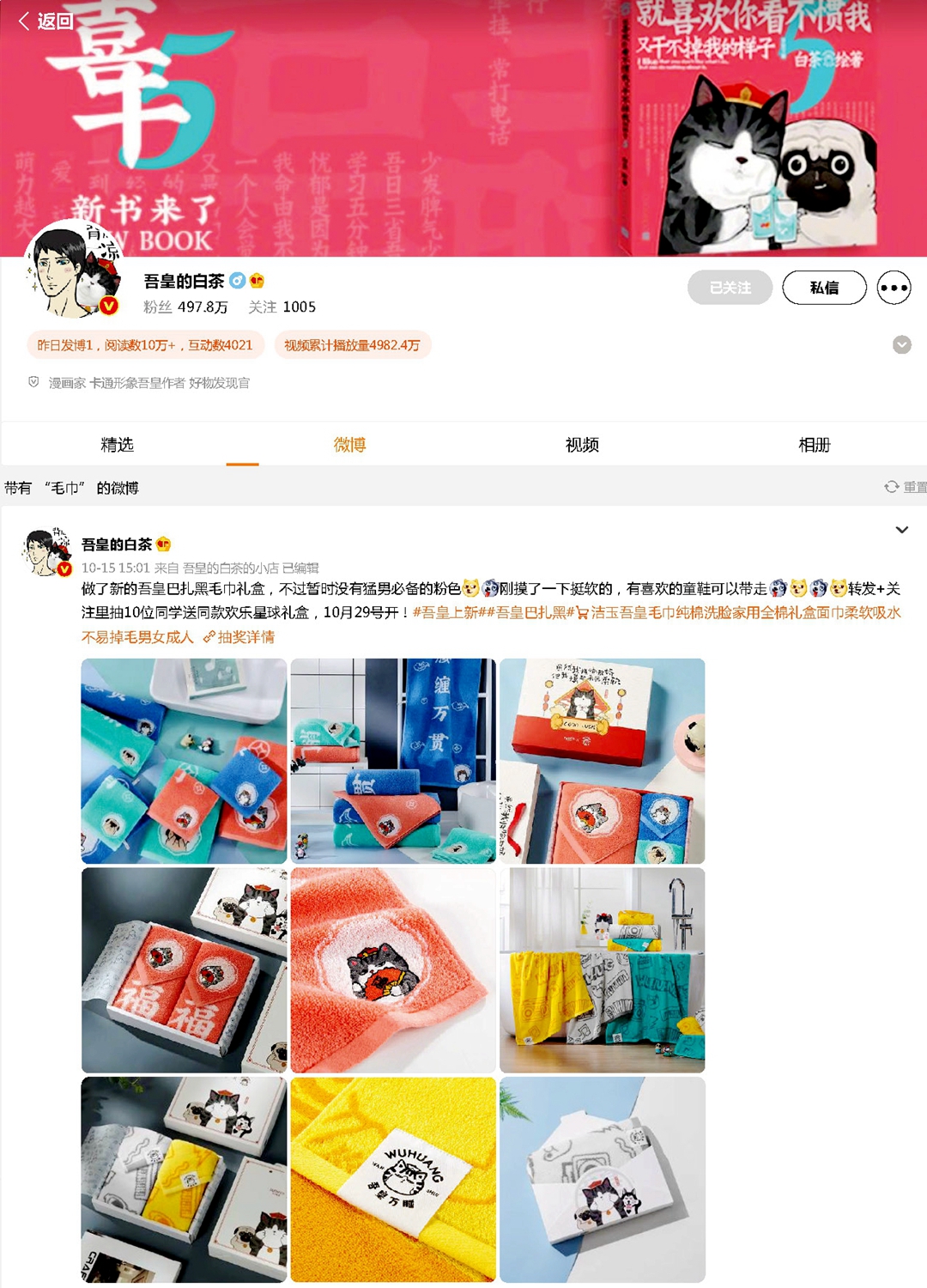 2021年10月15日,漫畫家、卡通形象吾皇作者“吾皇的白茶”發(fā)布微博,稱“做了新的吾皇巴扎黑毛巾禮盒,不過暫時沒有猛男必備的粉色,剛摸了一下挺軟的,有喜歡的童鞋可以帶走”,配圖赫然正是孚日集團攜手“吾皇萬睡”新推出的傲嬌巾品。